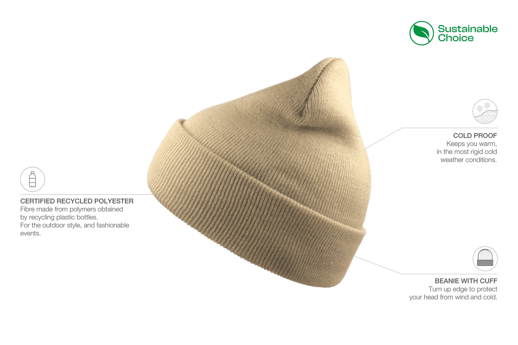 Classic shaped beanie with cuff in recycled polyester yarn. Double layer and circular machine finish. Soft hand feel for everyday use.